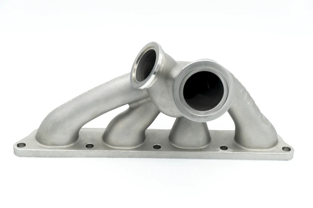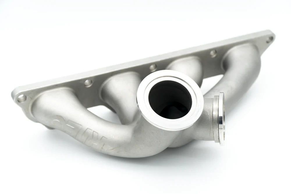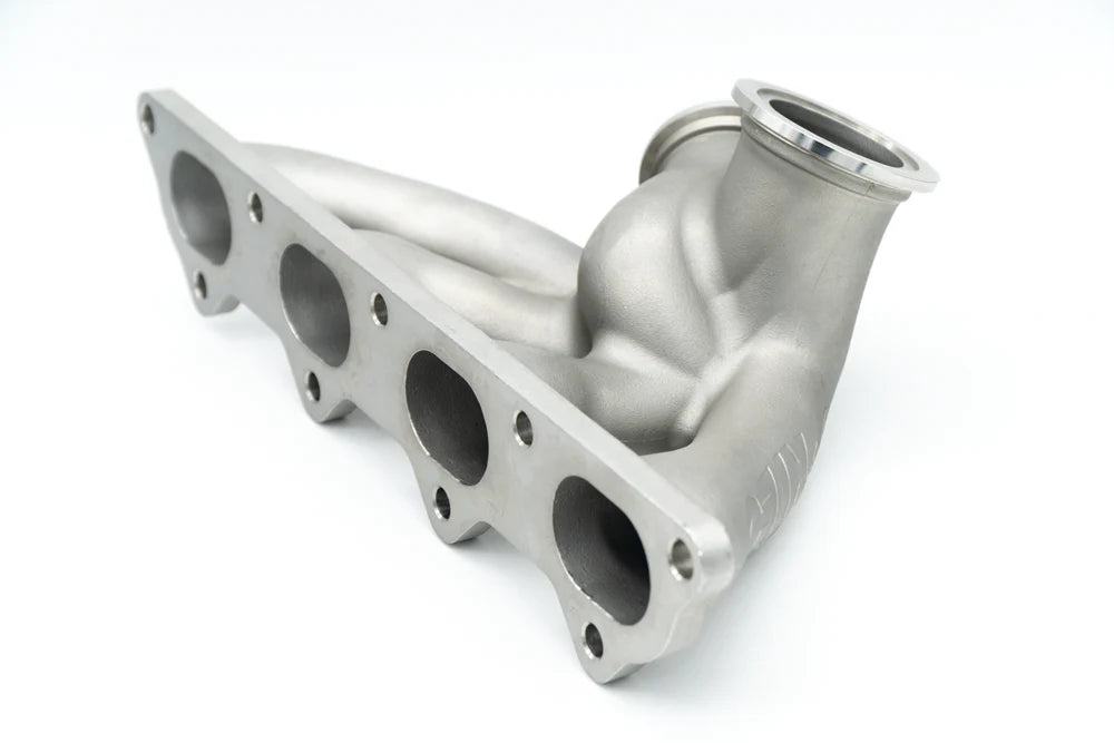 When we looked at the Evo manifold design, the objective was to reduce manifold internal volume to sharpen response and to also keep is as high flowing as possible. To do this we used a non tradition (in the aftermarket) reverse rotation design. This allowed us to NOT to use tight radius bends where other have to because standard rotation turbos put the turbine inlet flange closer to the block. We have used a reverse rotation turbo design, in much the same way as Mitsubishi did with the OEM equipment. This allowed us to low mount the turbo, use no tight radius bends, and also keep the manifold very compact. This design used a 33mm runner ID to help aid in very fast transient throttle response.