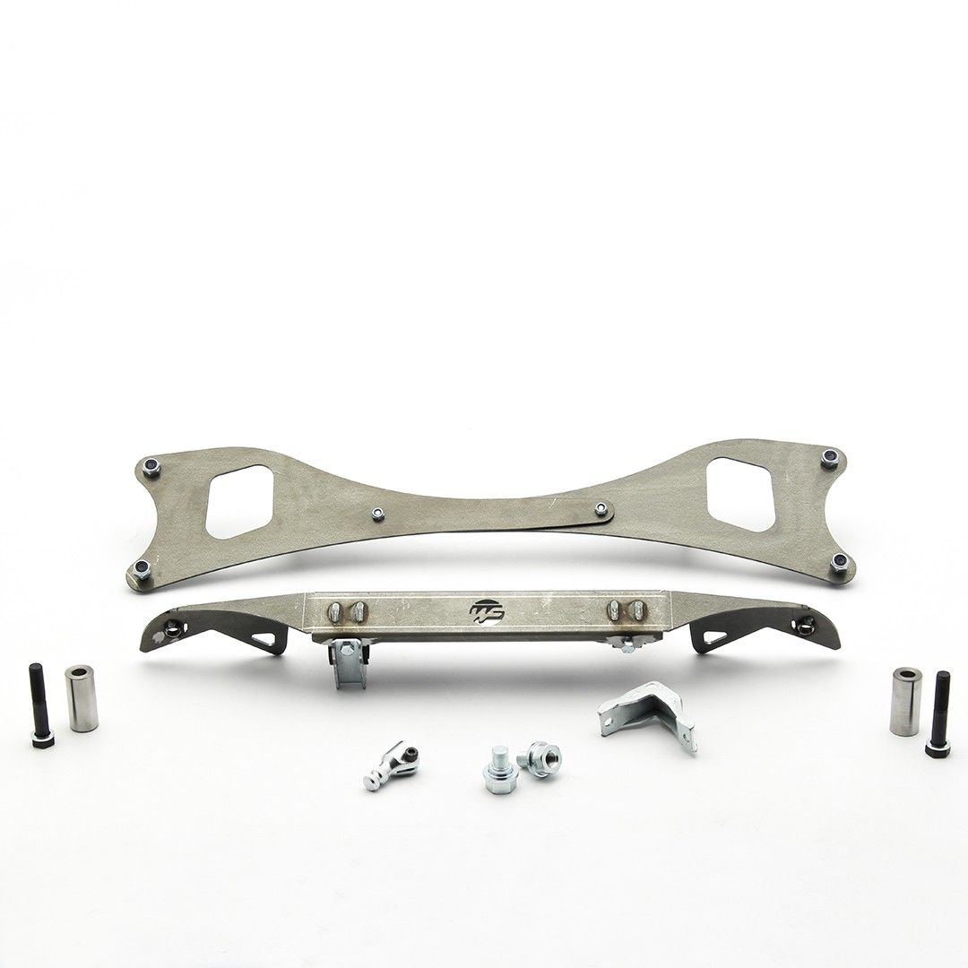 Nissan S Chassis steering rack relocation hardware. Requires OEM front subframe cutting and welding. It moves rack 46mm forward for better Ackemann curve and a 5mm lower for oilpan clearance. It works all big drift series rules that require OEM subframe usage, but allow modifications for rack relocation
