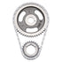 Edelbrock part #7803 Performer-Link timing chain is for use with Edelbrock or stock cams. They have a solid-bushing chain for a true bearing surface that rolls with the sprockets, eliminating chain stretch. Cam sprockets are made from 35,000 psi tensile strength cast iron. Crank sprockets are made from billet SAE-1144 steel and induction heat treated. Four Performer-Link sets are stock replacement parts and 50-state legal (see listings in bold type). All other sets have three keyway setting points to ensure accurate timing selection for early or late-model vehicles. Performer-Link timing sets are not for use above 6500 rpm- ? Performer roller chain sets are engineered to operate up to 6500 rpm.- ? Never hammer directly on chain or sprockets. You can crack the hardened links and pins and cause early failures. - ? Use a sleeve for installations that require hammering, a brass drift punch may be used if you carefully alternate blows on either side of the sprocket to avoid cocking. - ? Never stretch the chain with a screwdriver. - ? Check for clearance between the timing chain and block and between the chain and front cover before reassembly. - ? Be sure that both cam and crank sprockets are exactly in line with each other. Misalignment can cause chain to break